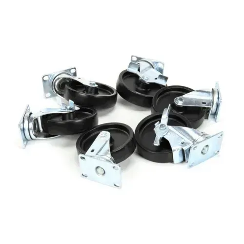 The AllPoints Foodservice Parts & Supplies 8006946 Plate Caster Kit features durable 5-inch outer diameter swivel casters designed for smooth mobility and easy maneuverability. The sleek black finish adds a professional look while ensuring long-lasting performance. Ideal for various foodservice equipment, these casters provide stability and support, making them a reliable choice for your operational needs.